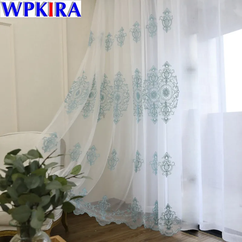 European Blue Embroidered Lace Tulle Curtain Living Room Bedroom