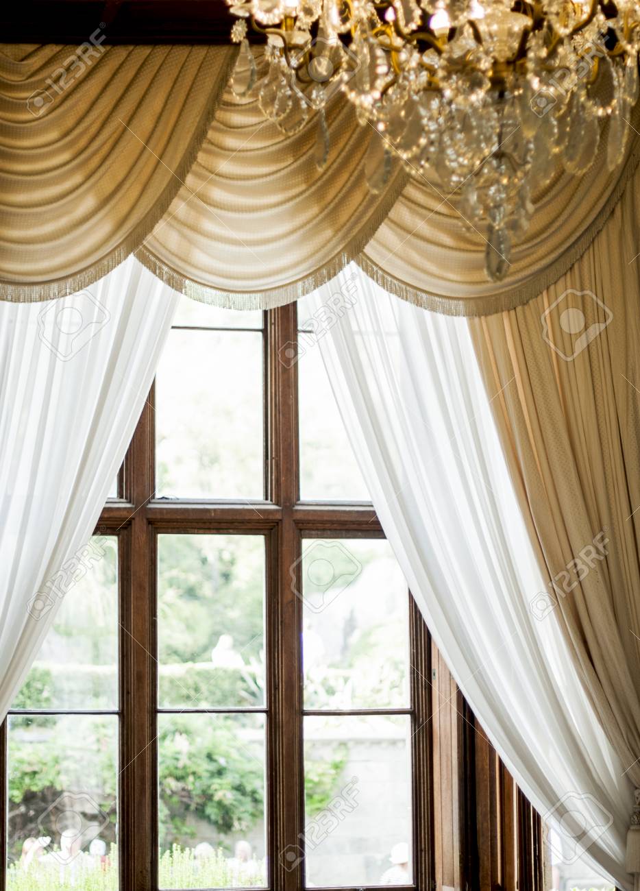 A Large Antique Window In A Wooden Frame With Curtains Stock Photo