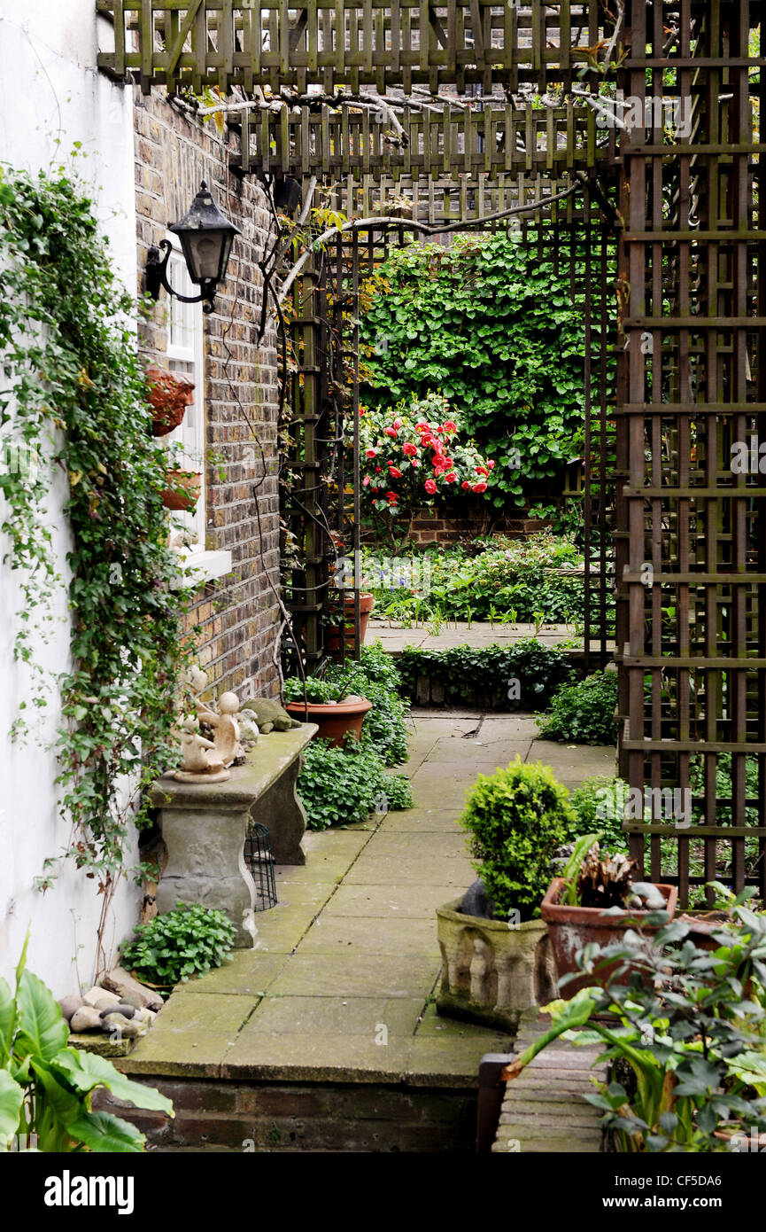 Hidden Treasure Paved Walkway Arched Trellis Potted Plants