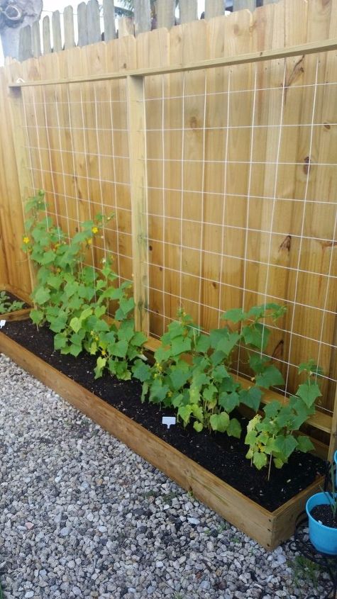 Lean to design gives you room to sow salad greens under the trellis for an extra crop before your cukes mature. A cucumber trellis can be anything sturdy that is 4 6 feet tall. From there we attached a piece of scrap fencing to the step in posts and fed the cucumbers through the fencing.