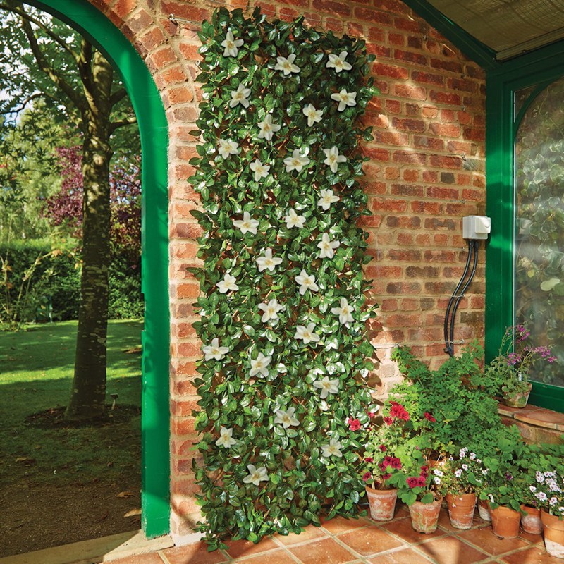 Artificial flower trellis. Our expanding trellis is perfect for screening off sections of your garden or covering up unsightly walls. The leaves and flowers are woven onto a natural willow trellis which can be easily attached to fences walls and railings to create an attractive outdoor feature. Great for hiding unsightly walls and fences this hedge trellis will add life to your garden or courtyard without the hassle and maintenance of natural plants.